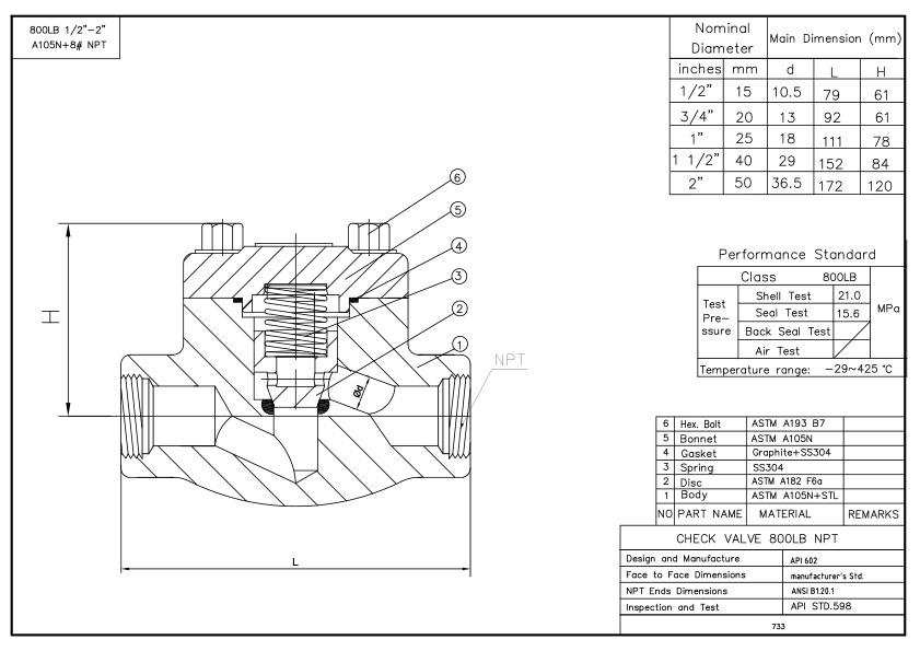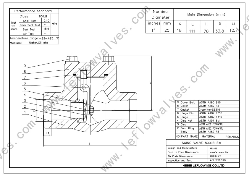 Leflow’s forged steel check valve is manufactured in accordance with API602, ISO15761 and ASME B16.34 and tested to API598.It has following characters: